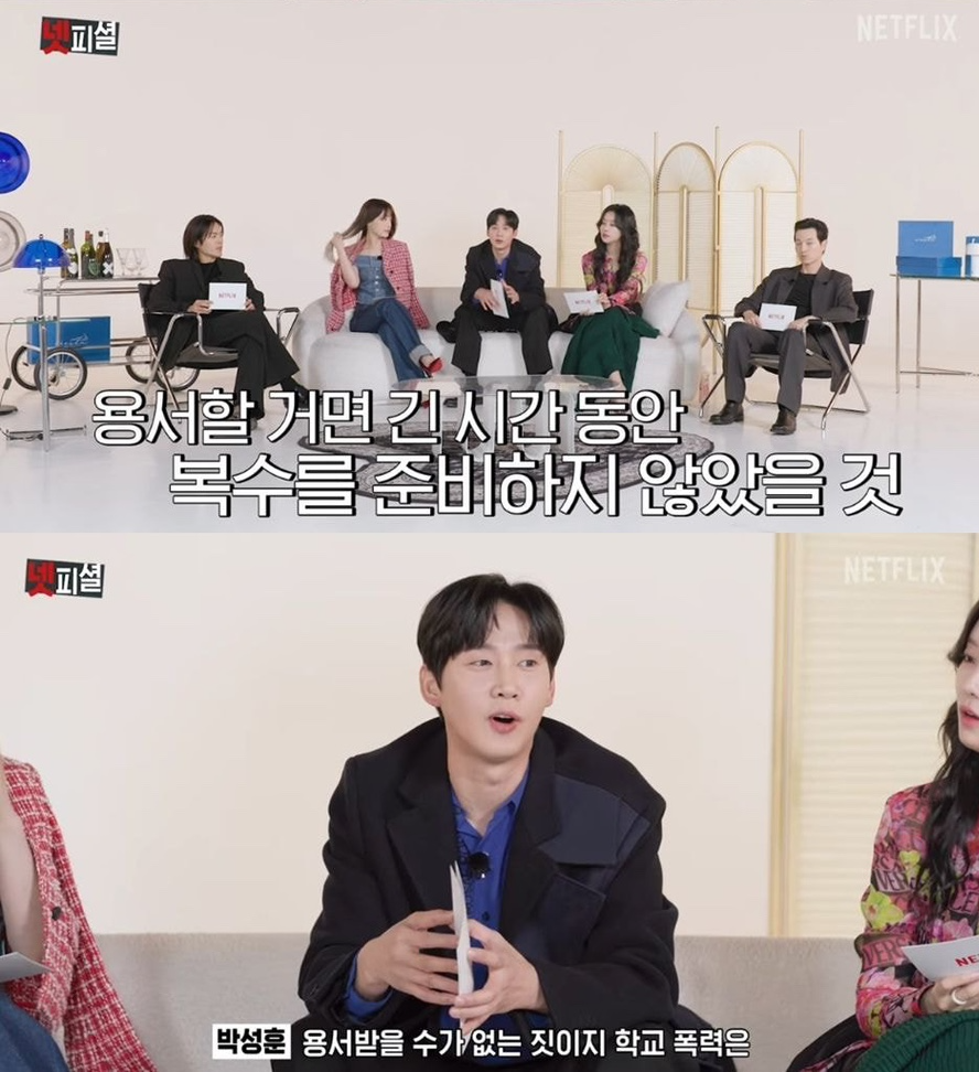 더글로리 배우들 말로는 "용서할 거면 긴 시간 동안 복수를 준비하지 않았을 것"이라며 용서 엔딩은 아닐거라는 말로 못을 박습니다. 배우 박성훈 (전재준 역)은 "용서받을 수가 없는 짓이지. 학교 폭력은..."이라 쐐기를 박습니다.